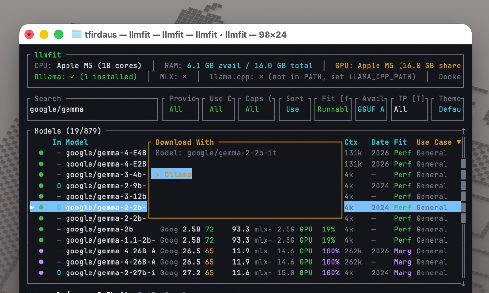 For example, if llmfit recommends google/gemma-2-2b-it, you can immediately hit d and it will show you “Ollama” as an option, as seen below: